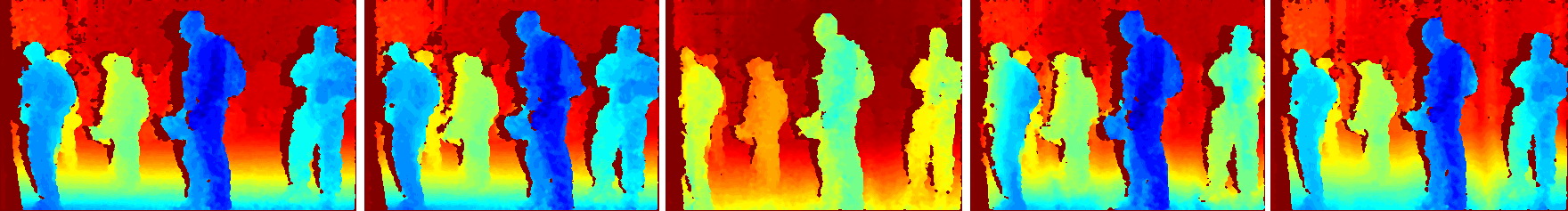 From top to bottom, left image, right image, and disparity map. We visualize the pixel disparity by colors ranging from dark red (the lowest absolute disparity) to dark blue (the highest one).