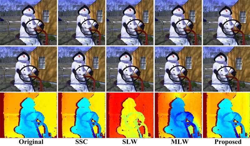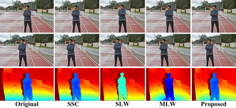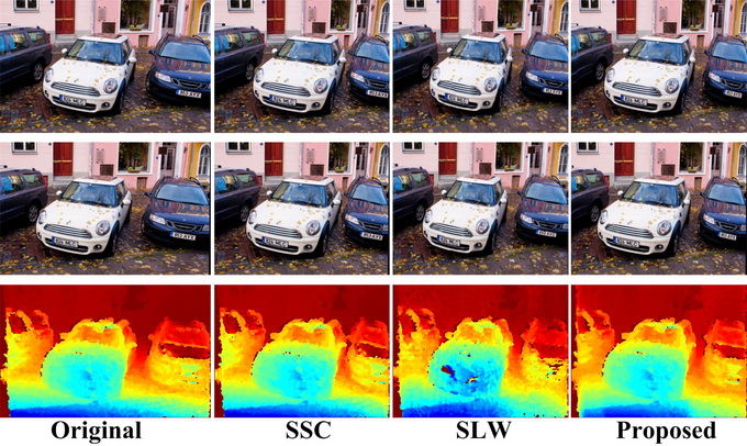 | The popularity of stereo images and various display devices poses the need of stereo image retargeting techniques. Existing warping-based retargeting methods can well preserve the shapes of salient objects in a retargeted stereo image pair. Nevertheless, these methods often incur depth distortion, since they attempt to preserve depth by maintaining the disparity of a set of sparse correspondences, rather than directly controlling the warping. In this paper, by considering how to directly control the warping functions, we propose a warping-based approach to stereo image retargeting which can simultaneously preserves the shapes of salient objects and the depths of 3D scenes. We first characterize the depth distortion in terms of warping functions to investigate the impact of a warping function on depth distortion. Based on the depth distortion model, we then exploit binocular visual characteristics of stereo images to derive region-based depth-preserving constraints which directly control the warping functions so as to faithfully preserve the depths of 3D scenes. Third, with the region-based depth-preserving constraints, we present a novel warping-based stereo image retargeting framework. Since the depth-preserving constraints are derived without taking into account shape preservation, we relax the depth-preserving constraints so as to reach a good tradeoff between shape preservation and depth preservation. Finally, we propose a quadbased implementation of the proposed framework. Our results demonstrate the efficacy of our method in both depth and shape preservation for stereo image retargeting. |