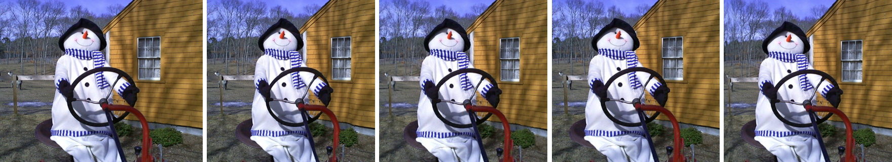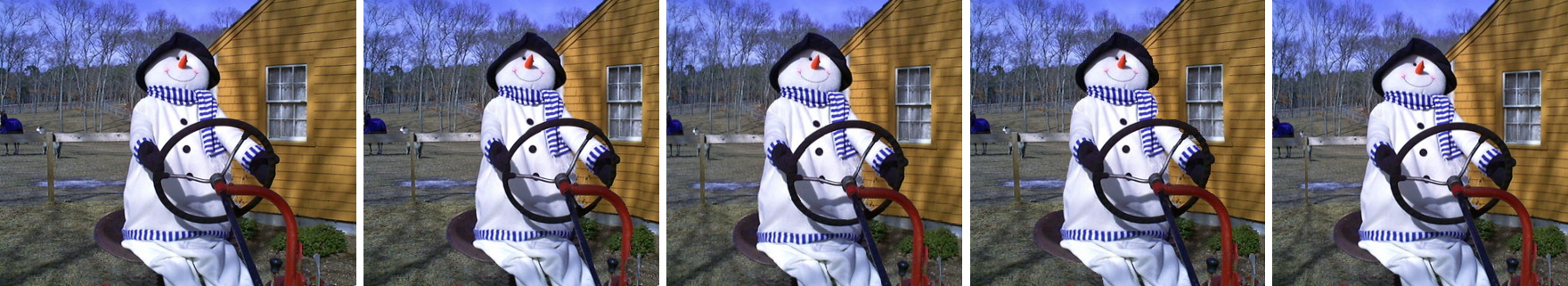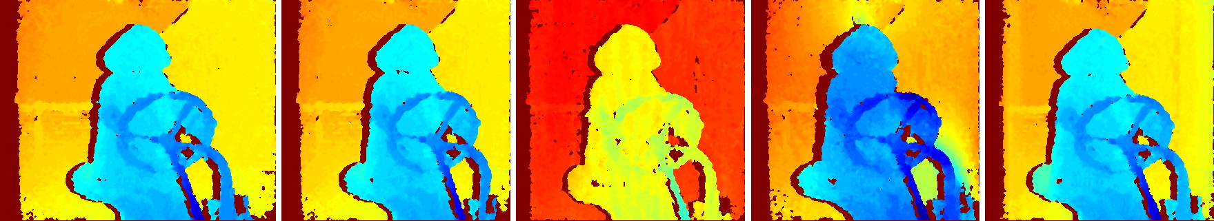 From top to bottom, left image, right image, and disparity map. We visualize the pixel disparity by colors ranging from dark red (the lowest absolute disparity) to dark blue (the highest one).